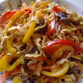 原料:豆腐皮、黄红彩椒、胡萝卜、木耳、葱、蒜、生抽、黄豆酱。