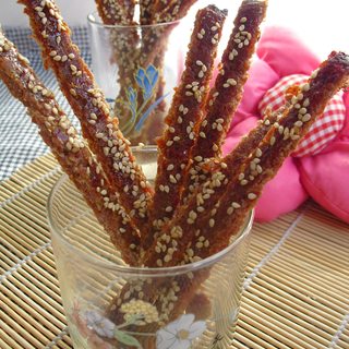 原料:猪里脊肉、芝麻、生抽、黑胡椒、料酒、盐、糖、蜂蜜。