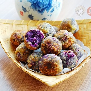 原料:紫薯、干吐司、淀粉、鸡蛋、熟芝麻、花生油。