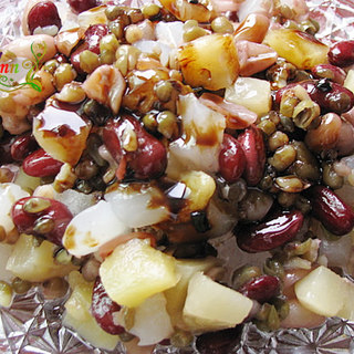 原料:自制蜜豆、什锦椰果、花生仁、绿豆、红豆、水、白糖、红糖。