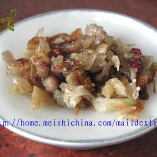 原料:甜菜脯、猪里脊、火腿、鸡蛋、葱、虾米、胡椒粉、生抽、盐、味精。
