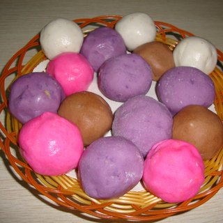 原料:水磨糯米粉、60℃热水、肉糜馅、豆沙馅、芝麻馅、栗蓉馅、红曲粉、南瓜汤、斑兰精。