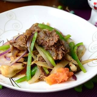 原料:熟牛肉筋、杏鲍菇、洋葱、青椒、西红柿、生抽、胡椒粉、盐。
