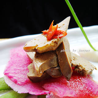 原料:鸭肝、葱、姜、盐水毛豆、心里美萝卜。