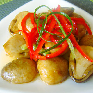 原料:草菇、红椒、葱、蒜、花生油、蚝油、盐。