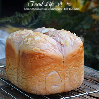 原料:高粉、熟紫薯、牛奶、蛋液、细砂糖、盐、干酵母、黄油、全蛋液、杏仁片。