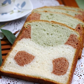 原料:高筋面粉、淡奶油、牛奶、白糖、蛋清、酵母粉、无盐黄油、白糖、蛋清、奶粉、酵母粉、盐、无盐黄油、可可粉、开水、抹茶粉、开水。