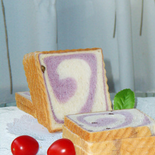 原料:高筋、黄油、奶油、南瓜泥、鸡蛋、盐、酵母、紫薯、糖。