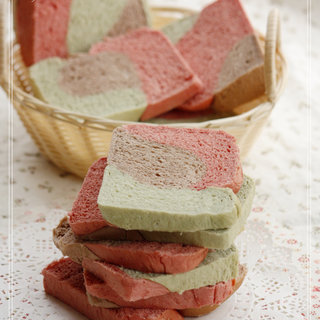 原料:牛奶、盐、白砂糖、高粉、酵母、黄油、红曲粉、抹茶粉、可可粉。