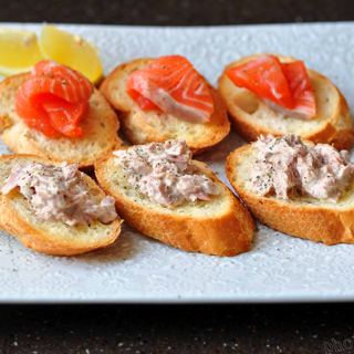 原料:法棍面包、三文鱼片、水浸金枪鱼罐头、蛋黄酱、黄油、盐、香草碎。