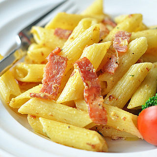 原料:斜管面、培根、鸡蛋黄、洋葱、蒜、罗勒、卡夫芝士粉、淡奶油、意面酱、盐、黑胡椒、橄榄油。