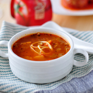 原料:洋葱、胡萝卜、土豆、圆白菜、培根、意大利细面、大蒜。