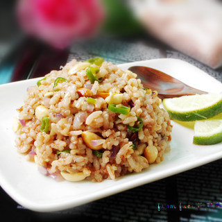 原料:哈尼梯田红米、花生、洋葱、矿泉水、香菜、细长辣椒、青柠檬、酱油、盐、芝麻油。