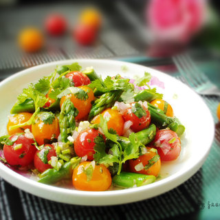 原料:红圣女果、黄圣女果、芦笋、香菜、洋葱、蒜、醋、糖、盐、油。