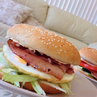 原料:餐包、生菜叶、鸡蛋、西红柿、青瓜、培根、花生酱、黄油。