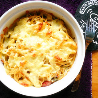 原料:意面、腊肠、乳酪、白菜、小鱼干、香菇。