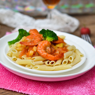 原料:意面、鲜虾、西葫芦、洋葱、西红柿、西兰花、盐、胡椒粉、料酒、 葱、姜、蕃茄酱、橄榄油。