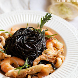 原料:墨鱼汁意面、虾、小目鱼、洋葱、熏衣草、甜辣酱、番茄酱、黄油、盐、红酒、生抽、糖、橄榄油。
