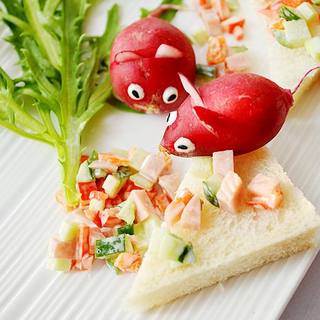 原料:土司1片、火腿肠、黄瓜、红椒、苦菊、樱桃小萝卜、丘比沙拉酱。