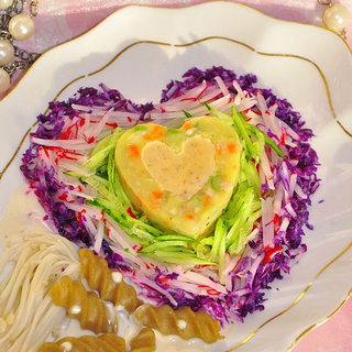 原料:土豆、茄子、自制熟猪肘子肉、豆角、胡萝卜、黄瓜、小萝卜、紫甘蓝、金针菇、螺旋莜面、油、盐、丘比焙煎芝麻沙拉酱、凯撒沙拉口味。