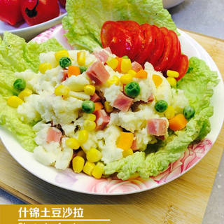 原料:土豆、火腿、蔬菜丁、小番茄、丘比沙拉酱、砂糖。