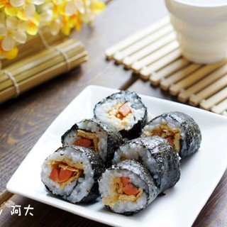 原料:大米、紫菜、火腿肠、鸡蛋、肉松、沙拉酱、白醋、白糖、盐。