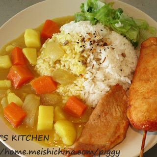 原料:米饭、土豆、胡萝卜、洋葱、西生菜、蒜蓉、猪排、鸡柳、咖喱块、盐、糖。