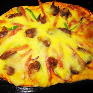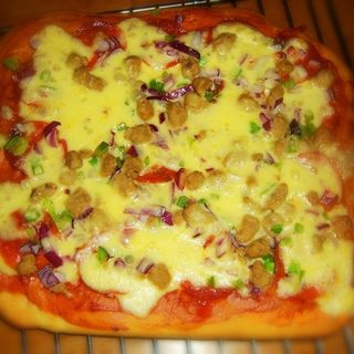 原料:高筋面粉、酵母、温水、黄油、糖、盐、洋葱、青椒、腊肠、香肠、芒果、茄子、自制蕃茄酱、马苏里奶酪。