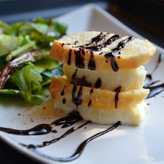 原料:长方形面包、青菜沙拉、香醋、布里芝士、橄榄油、盐、黑胡椒、八角、肉桂棒、红糖。