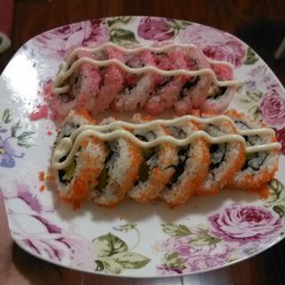 原料:寿司饭、厚蛋皮、虾卵、海苔。