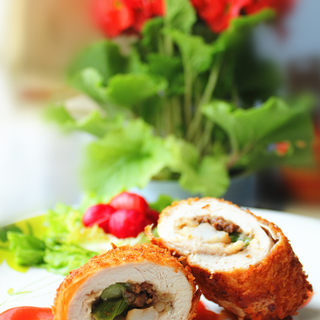 原料:猪肉馅、鸡胸肉、芦笋、仙贝、洋葱、奶酪丝、鸡蛋、面粉、酒、香草液、黑胡椒粉、脆炸粉、面包粉、番茄酱、泰式辣椒酱、盐。