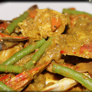 原料:梭子蟹、洋葱、蒜、姜、豇豆、胡萝卜、洋葱、咖喱粉、土豆粉。