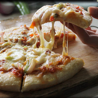 原料:高精面粉、酵母、温水、橄榄油、披萨酱、青黄椒、洋葱、白蘑菇、火腿、鸡蛋、红黄椒、盐、马苏里拉奶酪、黄油。