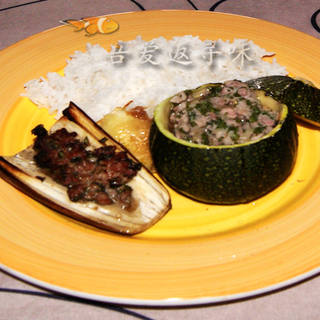 原料:肉馅、茄子、圆西葫芦、欧芹、红葱头、盐、胡椒粉、白葡萄酒。