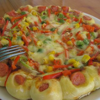 原料:高筋面粉、鸡蛋、青椒、红椒、美国杂菜、新奥尔良鸡肉、火腿。