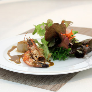 原料:北极带子、野生黑虎虾、沙拉蔬菜、胡萝卜、百合、黑椒粉、盐、橄榄油、黄金烧肉汁、黄油。