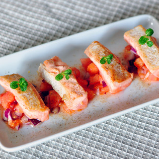 原料:带皮三文鱼腩、柠檬、西红柿、洋葱、盐、黑胡椒粉、橄榄油。