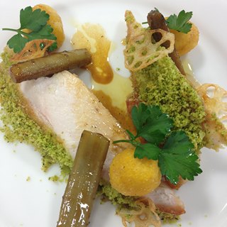 原料:鸡胸肉、欧芹、莲藕、大蒜、松枝、小红薯、面包粉、罗勒草、盐、黑胡椒、糖、橄榄油、黄油、西洋芥末酱。
