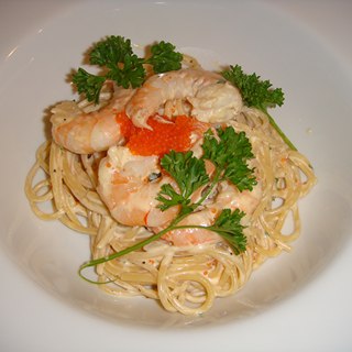 原料:虾、鱼子酱、意大利面、紫洋葱、蒜片、鸡蛋、切达干酪、香菜、奶油、盐、胡椒粉、油。