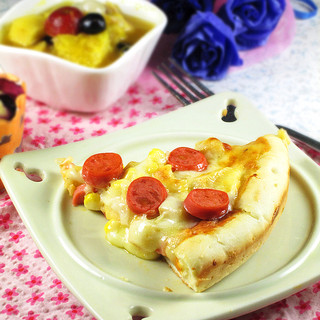 原料:面粉、酵母、黄油、温开水、苹果、火腿肠、甜玉米、披萨酱、披萨草、总统安文达切丝奶酪,、马苏里拉奶酪棒、马苏里拉奶酪、盐、白糖。