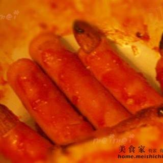 原料:土司、香肠、芝士、杏仁、美奶滋、番茄酱。