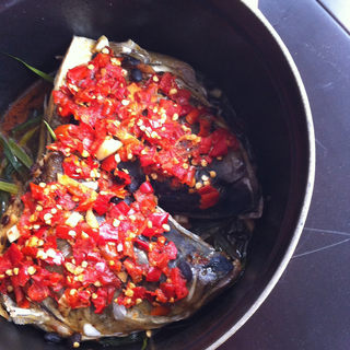 原料:鱼头、姜、葱、蒜、盐、料酒、醋、老干妈、剁椒、蒸鱼豉油、食用油。