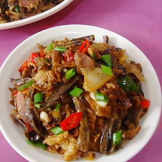 原料:盐菜、鱼干、腊肉、青椒、红椒、花椒、干辣椒、姜、蒜瓣、葱、蚝油、鸡粉、料酒、食用油。