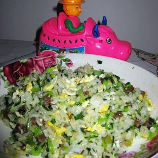原料:剩米饭、腊肠、青菜、葱花、食用油、食用盐、蚝油。