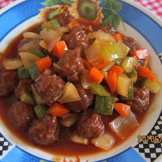 原料:猪肉、青瓜、红萝卜、香姑、大葱、姜蒜、太白粉、蛋、小红葱、油、黑醬油、黑胡椒粉、麻油、蕃茄酱、白糖。