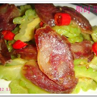 原料:苦瓜、腊肠、生姜、红椒、盐。