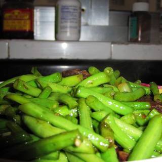 原料:腊肠、菜豆、葱花、食用油、食用盐、鸡精。