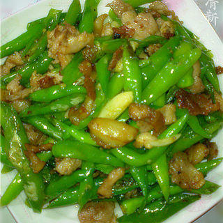 原料:小青椒、带皮猪肉、大蒜头、味精、油、盐、老抽。