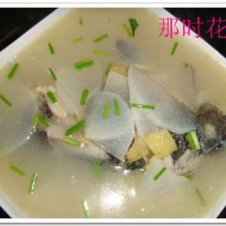 原料:鲫鱼、白萝卜、生姜、小葱、盐、料酒、白胡椒。