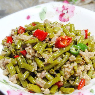 原料:肉馅、酸豆角、青红辣椒、蒜米、盐、酱油。